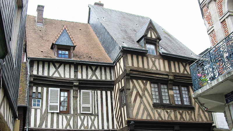 Les maisons à colombages reposent sur une ossature en bois, avec un remplissage entre les pièces de bois : historiquement du torchis (argile + paille), protégé ensuite par un enduit, issu d’un artisanat normand, au charme reconnu.
