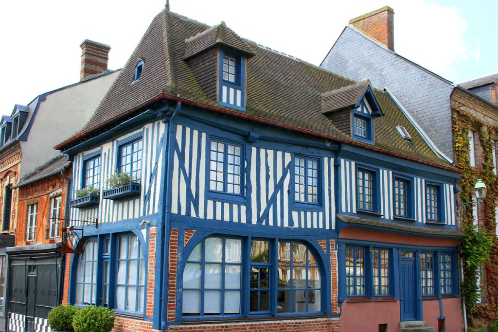 Sur la côte notamment dans les stations (Côte Fleurie par exemple), on croise des villas qui réinterprètent les codes normands : pans de bois parfois décoratifs, pignons marqués, bow-windows, brique, détails plus urbains. C’est un autre visage du patrimoine régional : moins rural, plus typique des maisons de bord de mer, autour de Deauville et des plages voisines.