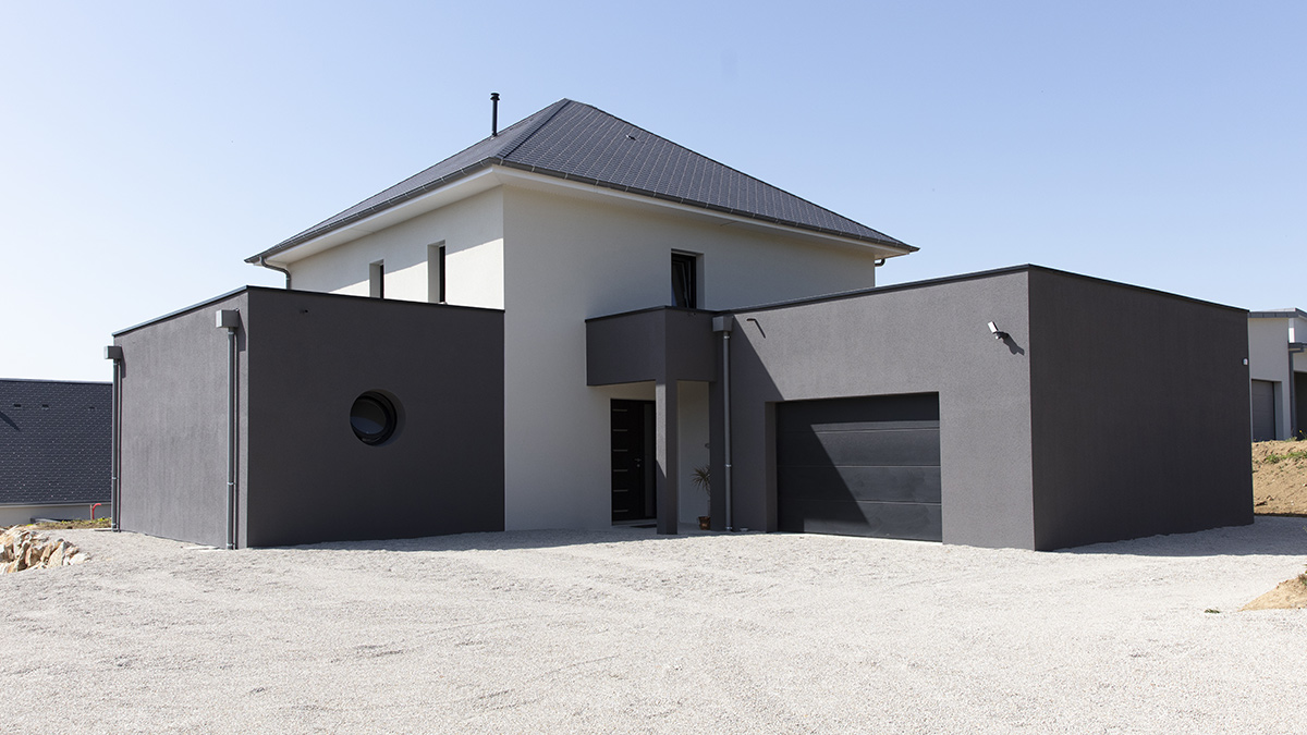 Cette maison de 145 m² se distingue par l’association harmonieuse d’un toit à quatre pans principal en ardoise et de toits plats sur ses volumes annexes.